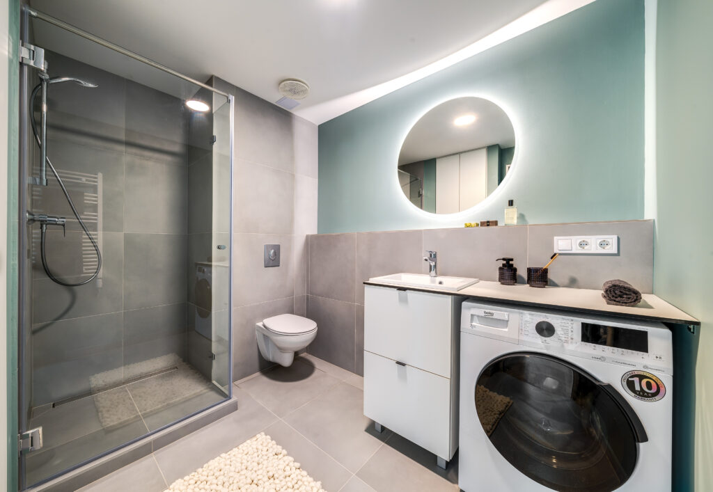 A fürdőszobában található egy méretre készített tágas üvegajtós zuhanykabin és egy Beko mosó-szárítógép is.